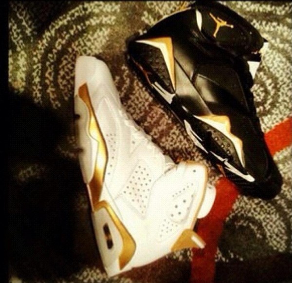 Another glimpse at the upcoming “Gold Medal” packย shows both the VI and VII, with the VI sporting a predominately white leather look and the VII combining nubuck and leather in a black colorway. Both kicks feature metallic gold accents throughout.