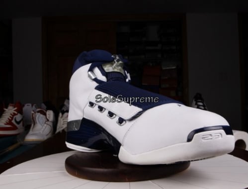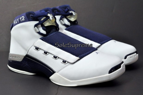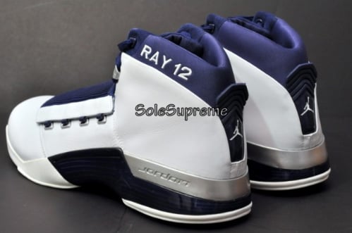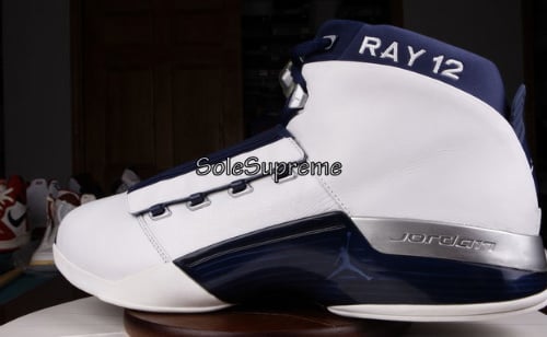 Some may know Boston Celtics sharpshooter Ray Allen is signed under Jordan brand, so we are bound to see Ray with some player exclusives. This Air Jordan pe was assign to Ray back in his USA basketball team, which explains the shoes why and navy colorway. Theย Air Jordan XVII Ray Allen exclusiveย features a white leather upper with a crome eyestay and accents throughout. A navy blue appears on the midsole, shroud and ankle collar. The words โRAY 12โณ is embroidered in white paying tribute to Allen and his Olympic number. Now these are available on ebay, check after the jump for a link to the auction and more shots of this AJ XVII exclusive.