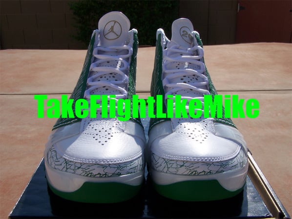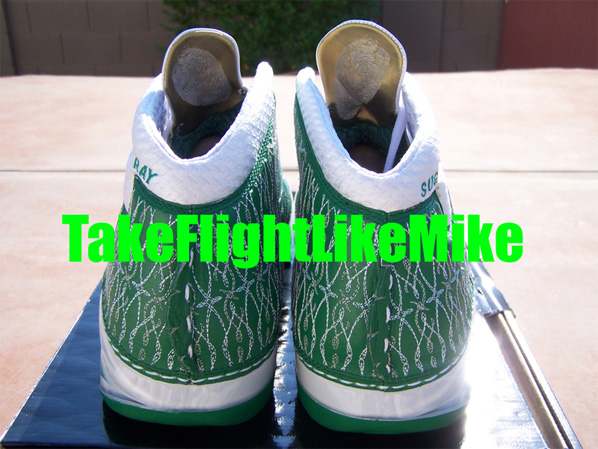 With that said, Ray Allen was seen sporting a special make-up of the Air Jordan XX3, a Player Exclusive with the words “Sugar Ray”ย embroideredย at the heel. Furthermore, a Boston Celtics color-way of simply white and green finish off the XX3. A detailed view can be seen after the jump. Via The Resident/Kenlu.