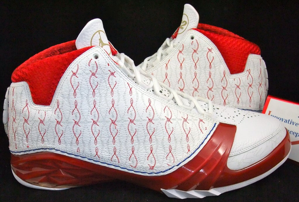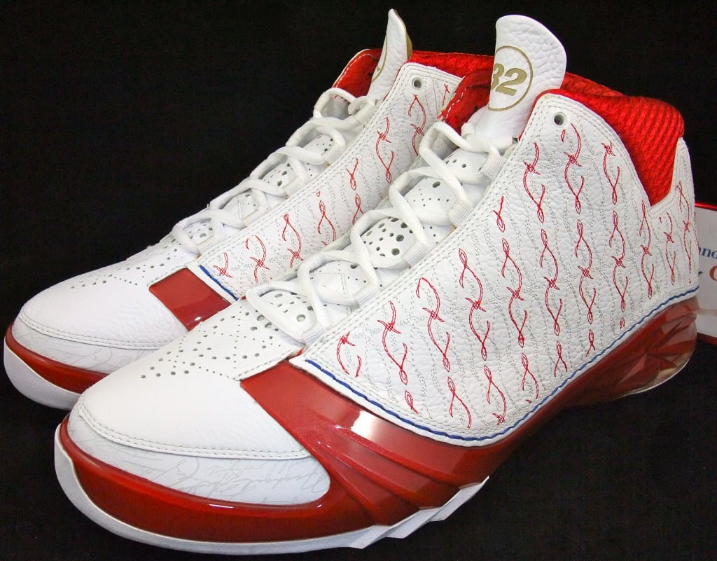 Donning a red and white motif, this Air Jordan XX3 features royal blue accents, a red inner lining, the sneakers’ unique 3-D side panel design, and signature Jordan branding plus Ripโs jersey number โ32โณ in gold as displayed on each tongue. Whether you’re a Hamilton fan or not, these kicks deserve to be in anyone’s collection.