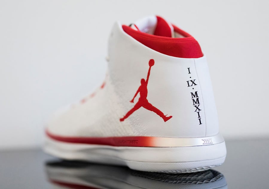 Looking closer, this Air Jordan XXX1 comes dressed in a Red, White and Black color combination. As you can see they feature a predominate White upper. The highlight is the stitching that represents Greenโs post-surgery scar, the date of the surgery, the name of the doctor who operated on him, and the American Heart Association logo on the tongue. Other details include Red on the Jumpman branding while the shade gradients just above the midsole while White covers the outsole.
