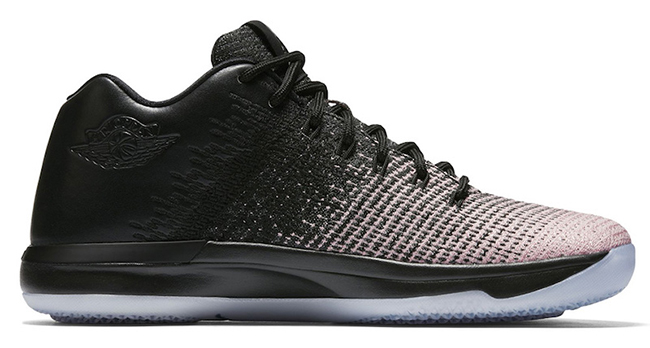 This Air Jordan XXX1 comes dressed in Black, White and Pink throughout. Starting at the heel which is Black, it slowly gradients as we get closer to the toe into a Pink shade. Following we have Black across the midsole while the outsole is done in a icy translucent finish.