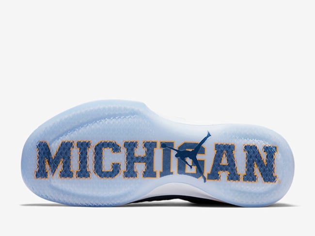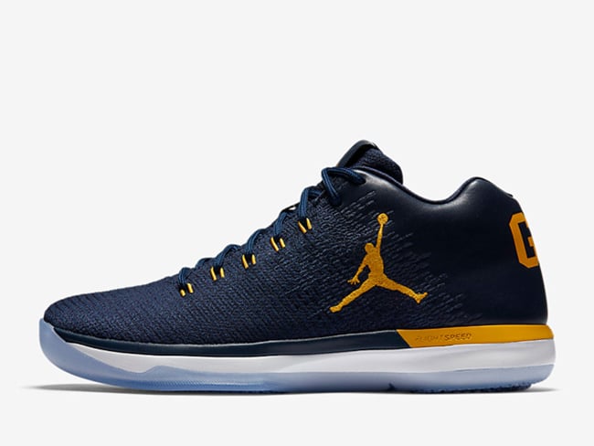 This Air Jordan XXX1 for Michigan features a College Navy and Amarillo color theme. Representing the Wolverines, they feature โGOโ and โBLUEโ across the heels. Following we have the block โMโ logo on the insoles while the translucent outsole exposes โMichiganโ.