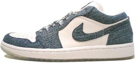 Another Air Jordan Retro 1 (I) Womens Low to add to the archives is the Air Jordan 1 (I) Retro Womens Low White / Denim. A lot less denim used than the other pair, and features more White. The laces feature the same color print as the denim. Released May 19th 2007.