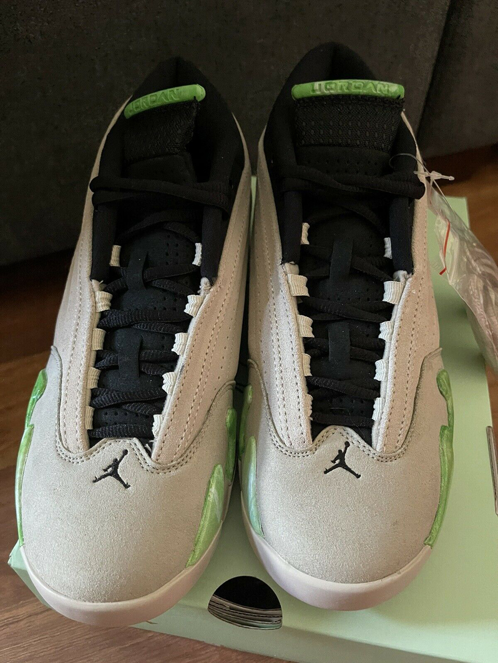 This low-top Air Jordan 14 comes dressed in a Light Sand and White color combination. Looking closer, the pair features Sand across the uppers while constructed with suede. Complimenting the upper, the midsole and teeth feature a marbleized or Jade finish dipped in Green. The same color and pattern land on the top of the tongue and some of the branding. Next, Black runs down the tongue, accents the laces, Ferrari emblem on the side, and liner. Adding to the premium look, Metallic Gold covers the midfoot shank plate.