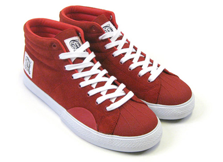 Alife has already presented an array of models over the past few days and now we get a look at two more styles that will be releasing in the Fall/Winter 2008 collection. The Shell Toe appears in a mid-top cut along with a suede upper and shell toe. Alife adds their signature touch with their cursive like ‘A’ logo on the heel and togue. The Shell Toe is available in red and grey now at Haven.