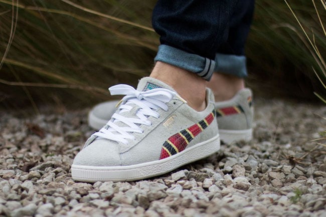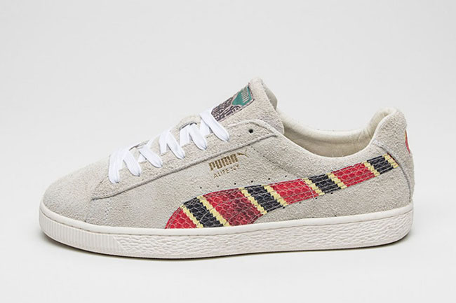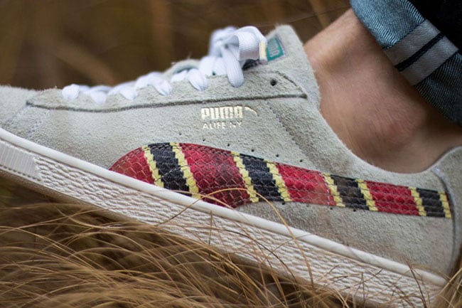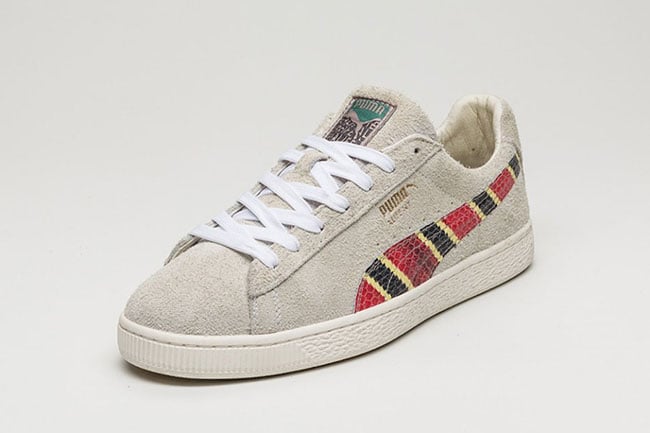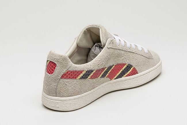 The Puma States in connection with Alfe NY uses a Grey base which is referred to as Oatmeal. The Puma branding on the sides has textured leather while the colors used mimic that of a Scarlet Kingsnake. Other details include White laces and an Off-White rubber midsole.