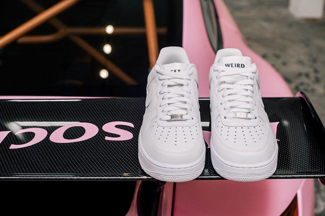 Using one of Nike Sportswear most known classics, the Nike Air Force 1 Low, they keep things even more simple and sleek by going All White on the uppers in addition to a leather construction. By the heel is Anti Social Social Club which replicates the waves you see in their branding. On the tongue is ‘GET’ and ‘WEIRD’ which is the brands slogan.