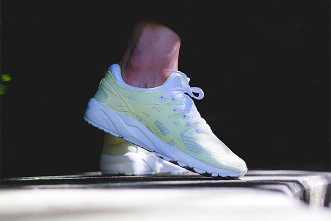 As you can see, this Asics Gel Kayano Trainer uses lighter tones for the summer. Looking closer, you can see that both White and Tender Yellow graces this pair. As for construction, they are built with mesh that will aid in air flow. Tender Yellow runs through the base while White compliments the the shade by being placed on the midsole, laces, tongue and around the collar.