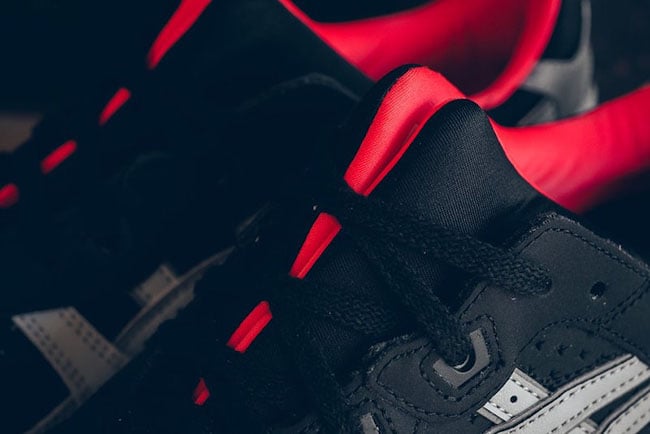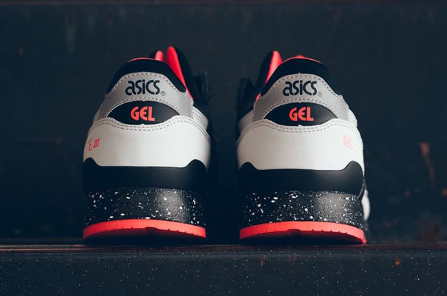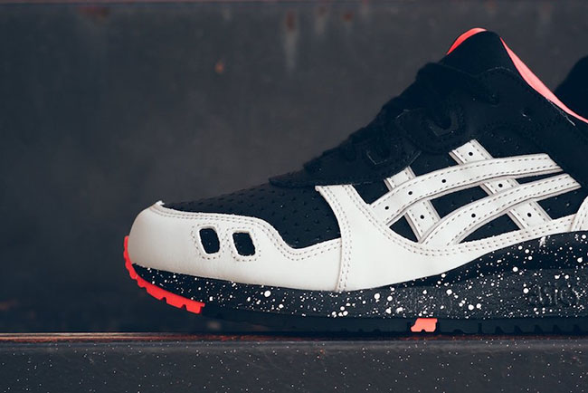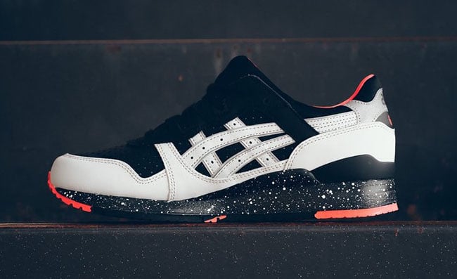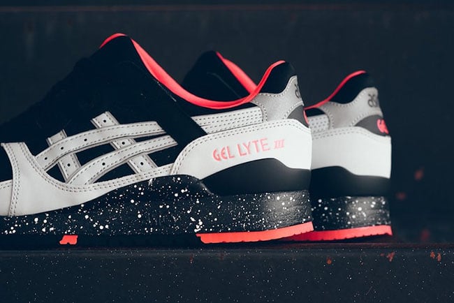 This Asics Gel Lyte III is dressed in Black, Light Grey and Mango which almost looks Pink. The overlay which is dressed in Grey is made of suede while the toe box and base uses Black leather. Adding pop to the shoes is the use of Mango that is accented on the outsole, liner and Gel Lyte III by the heel. Finishing this pair off is a Black midsole with a speckled overlay.