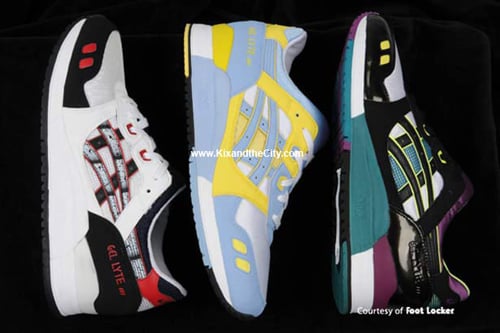 Earlier today, reports of a collaboration between Asics and Mita Sneakers were announced, here’s a look at three more Gel Lyte III’s Asics has lined-up for this Summer. First of the three, is a Denver Nuggets inspired model that consists of blue and yellow. The next Gel Lyte III is made up of purple, green and black, while the last model features a simple mixture of white, red and black. Available soon at select boutiques and Footlocker locations. Via katc.