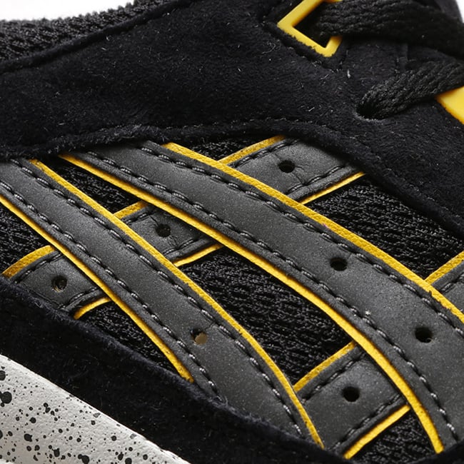 While the color code says the Gel Respector comes in black and dark grey, there are a few more shades involved. Using a mesh and suede black base, dark grey accents are spotted speckled across the midsole and around the heel counter. Yellow is also featured which hits the tongue branding, eyelets and outlines the logo on the side panels.