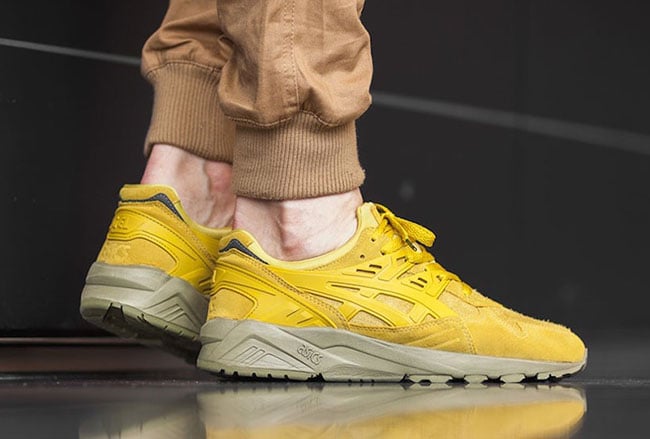 First up is the Asics Gel Respector which features a nubuck upper with reptile texture Green on the overlays. A bit of mustard Yellow is seen on the heel and lace tips while a Tan midsole completes them. Next up is the Asics Gel Kayano Trainer which is a bit brighter due to its predominate use of Yellow. Constructed with suede, a darker shade of Tan runs through the midsole.