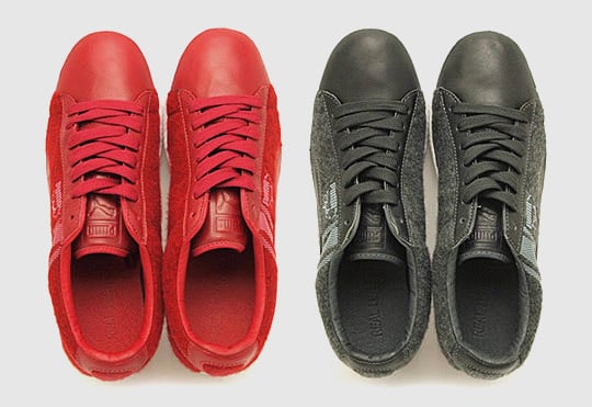 The Japanese giant combines the simplicity of the Puma Clyde silhouette with atmos flare. Today, we preview 2 colorways of the atmos x Puma Clyde “Survival Pack” ย in a solid black and solid red. Both shoes feature premium leather and wool uppers, unique scaling in the design, and finished off with white midsoles.