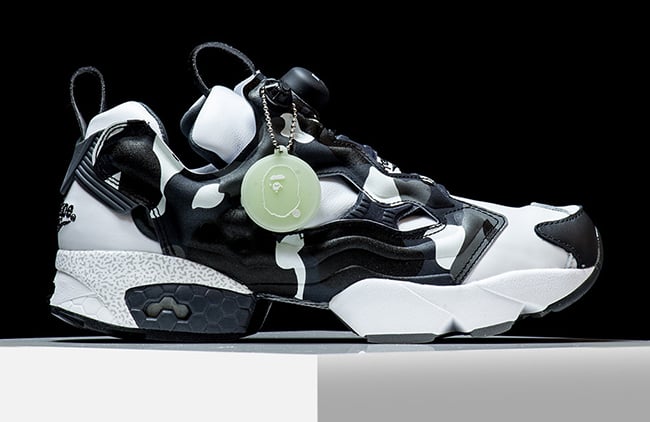 This Reebok Insta Pump Fury by Bape and Mita comes in a clean White base that extends across the toe and around the collar. Dark camouflage detailing is seen on the panel overlays that flows through the heel which connects to Bape. On the heel is an embroidered Bape logo while another Bape head is seen on the hangtag.