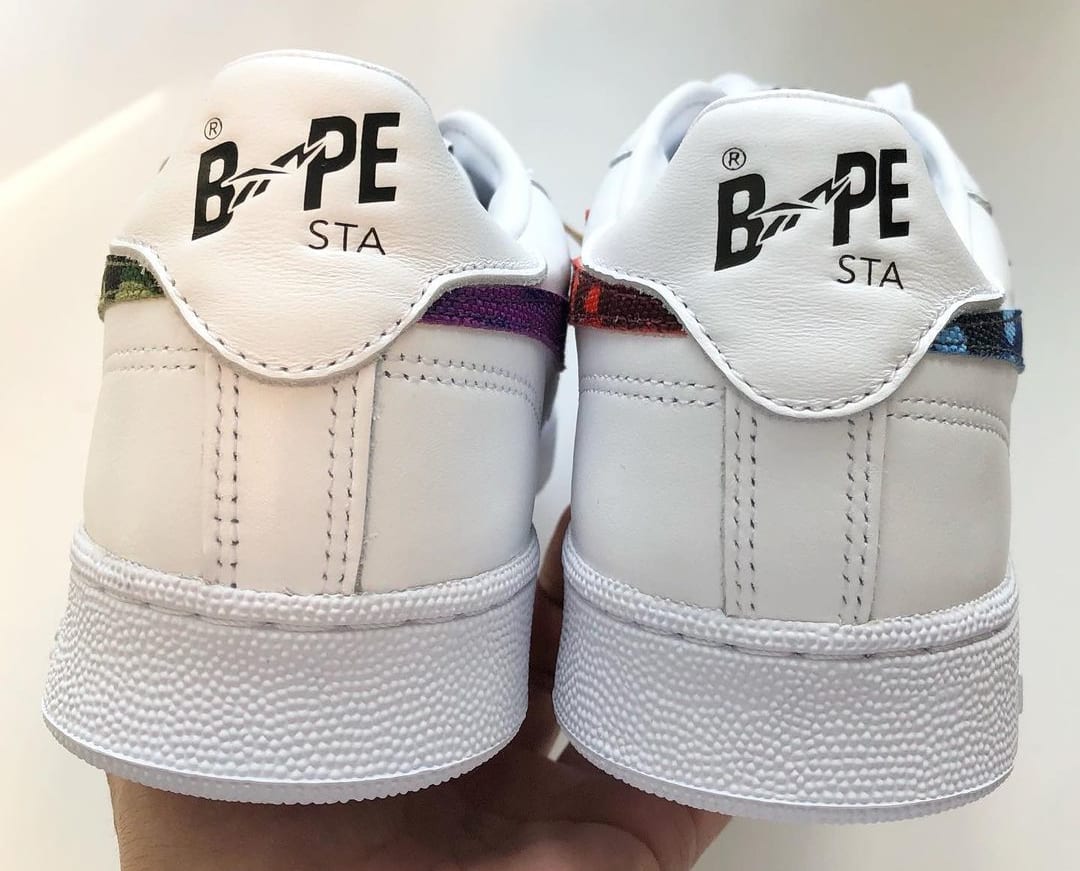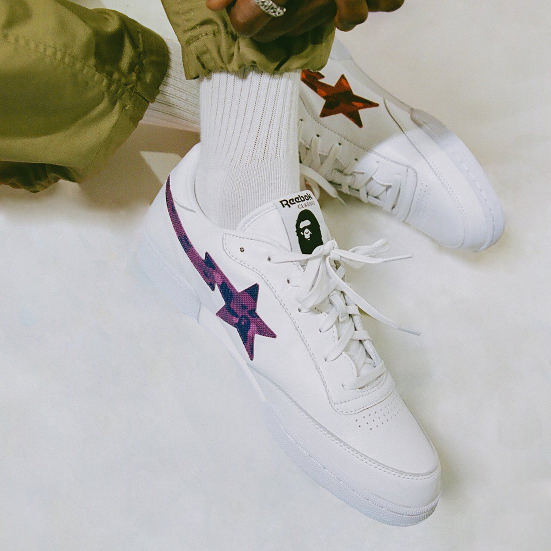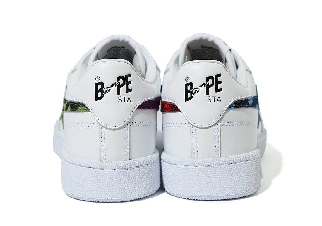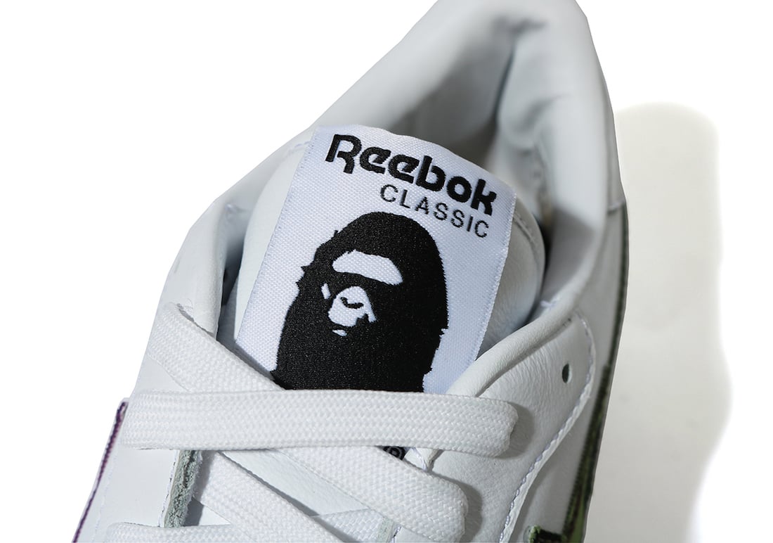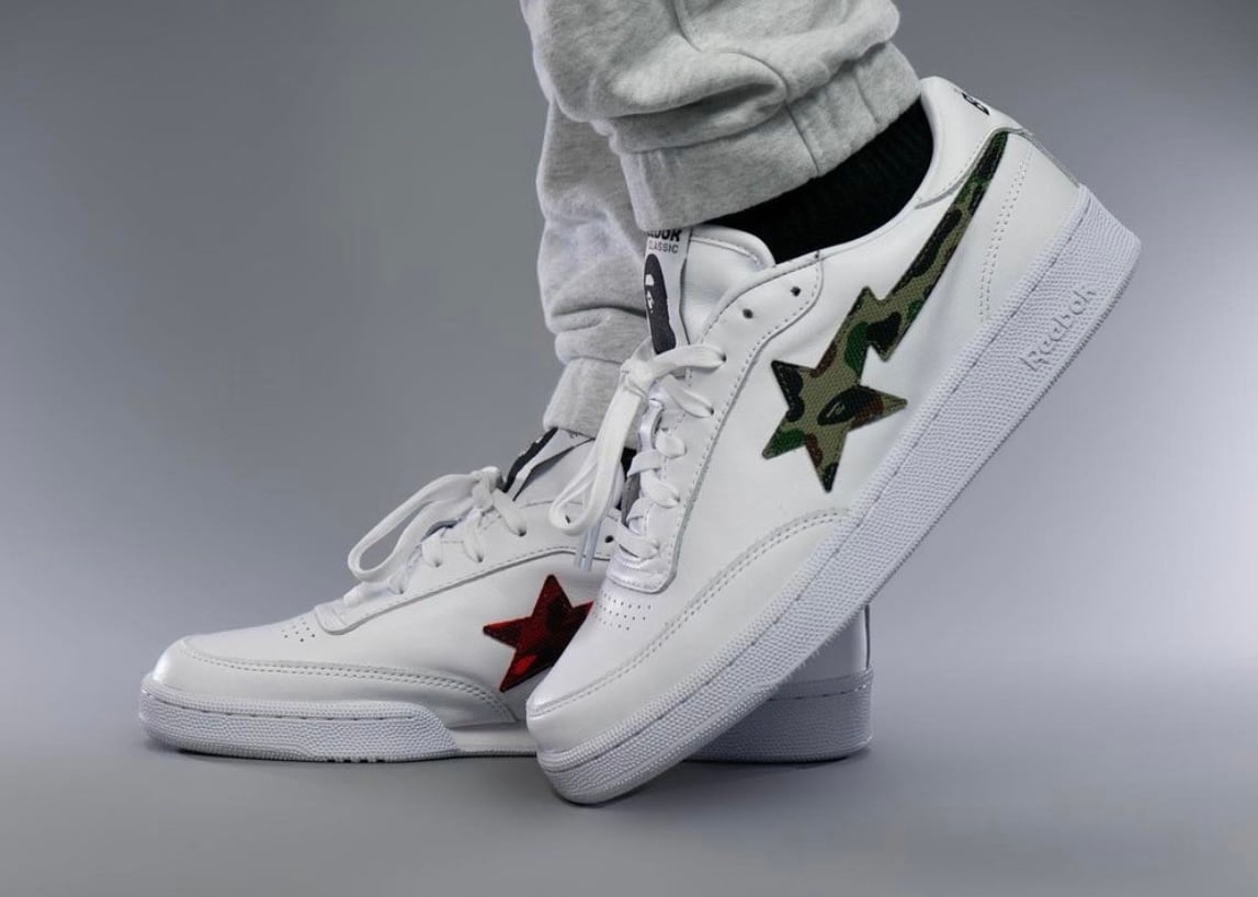 Looking closer, this Reebok Club C comes with White leather on the upper along with the star motif on the panels. Furthermore, it comes with camouflage detailing in Blue, Purple, Red, and Olive Green. Following, the Ape head branding lands on the tongue while the heel adorns โBape Sta,โ but the A is replaced why the Reebok vector logo. Finally, a White midsole and matching rubber outsole finishes the look.