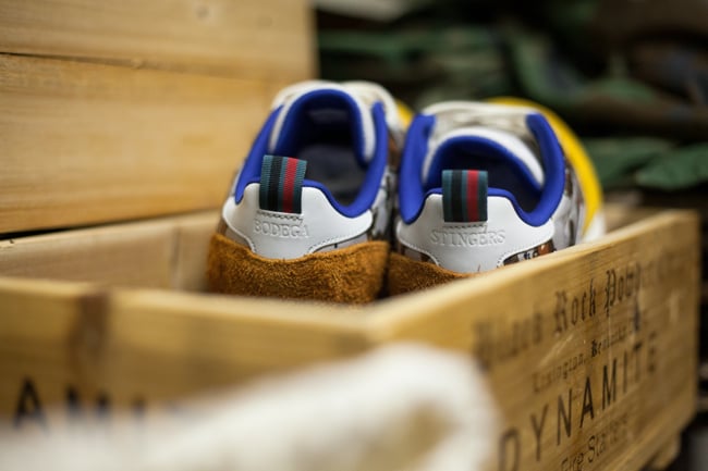 Inspired by “military nicknames assigned to specialized military divisions”, this 30th anniversary model adopts a “Killer Bee Stingers” alter ego with a yellow suede toe box and brown suede heel counter. Complete with desert camouflage midpanels and a purple inner lining, the “U.S.B.D.G.A.” is finished up with tongue and heel branding, plus commemorative graphic insoles.