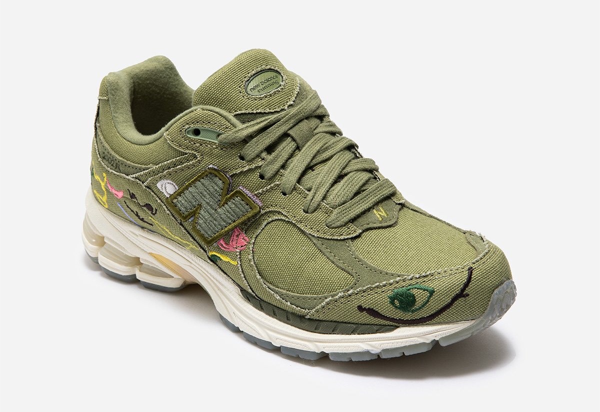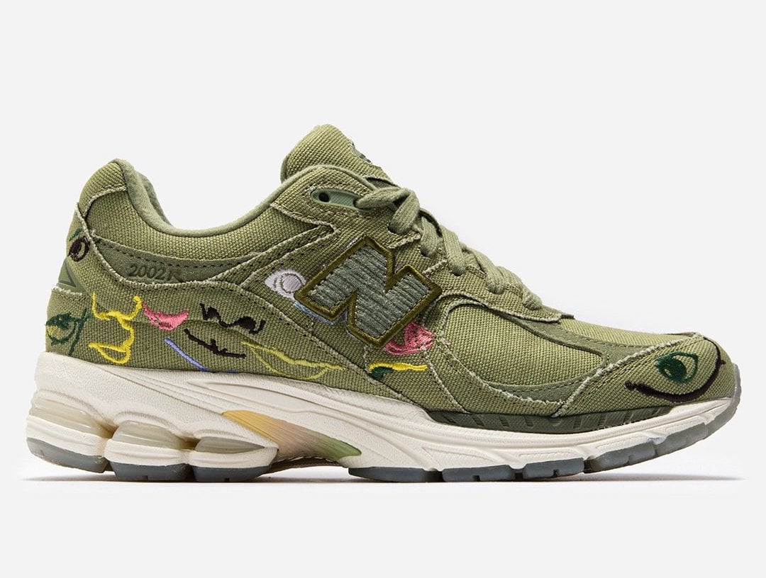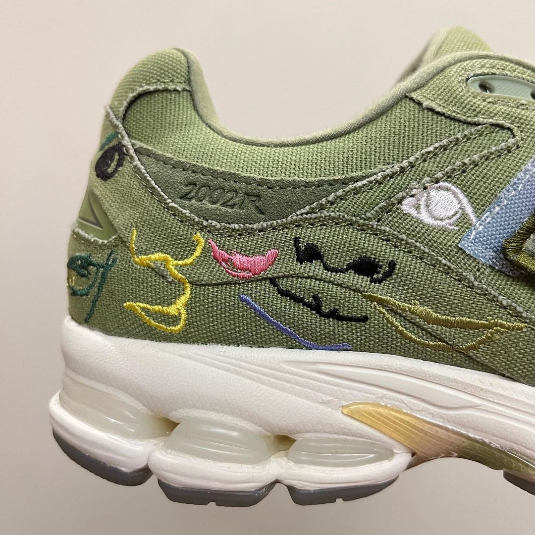 This New Balance 2002R comes with Olive Green canvas across the upper while embroidered artwork lands throughout. Next, we have โWhat Now?โ on the heels which is a tribute to Giles collection that launched in December during Art Basel in Miami. The โNโ logo on the lateral is velcro which can be removed while artwork is printed on the insoles to finish the look.