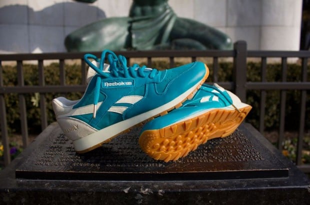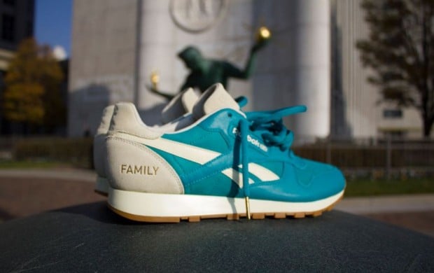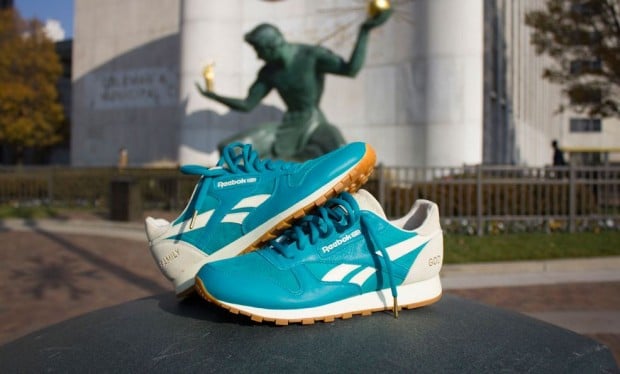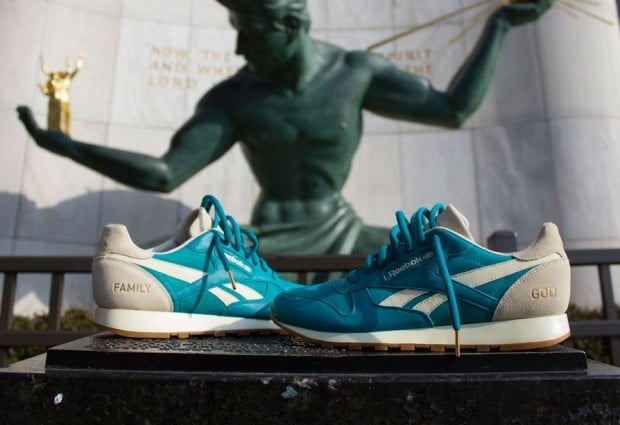 What essentially pays homage to the city of Detroit and the Marshall Fredericks bronze statue that is located at the Coleman A. Young Municipal Center on Woodward Avenue in Detroit, this Reebok Classic Leather takes on leather, nubuck, and suede construction with a predominately teal upper that is highlighted by its white overlays, gum buttom, and the words “Family” and “God” which serves as the focus to this collab. What also comes complete with extra “Burn Rubber” laces, these kicks are finish off by debossed tongue branding.