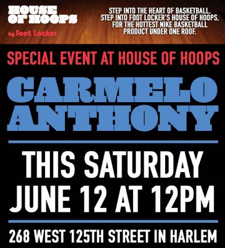 Earlier this year the winner of Nike’s 2009 Future Sole Competition got the opportunity to meet Carmelo Anthony while the former Syracuse Orangeman was getting his hair cut. However, if you’re going to be in the New York City area this weekend, your chance might come as well. This Saturday, June 12th, Carmelo Anthony will be stopping by the House of Hoops location in Harlem to meet and greet some of his lucky fans. If you’re in the area and have time, the trip to Manhattan’s upper west side might be well worth it- especially if you get a signature or two.