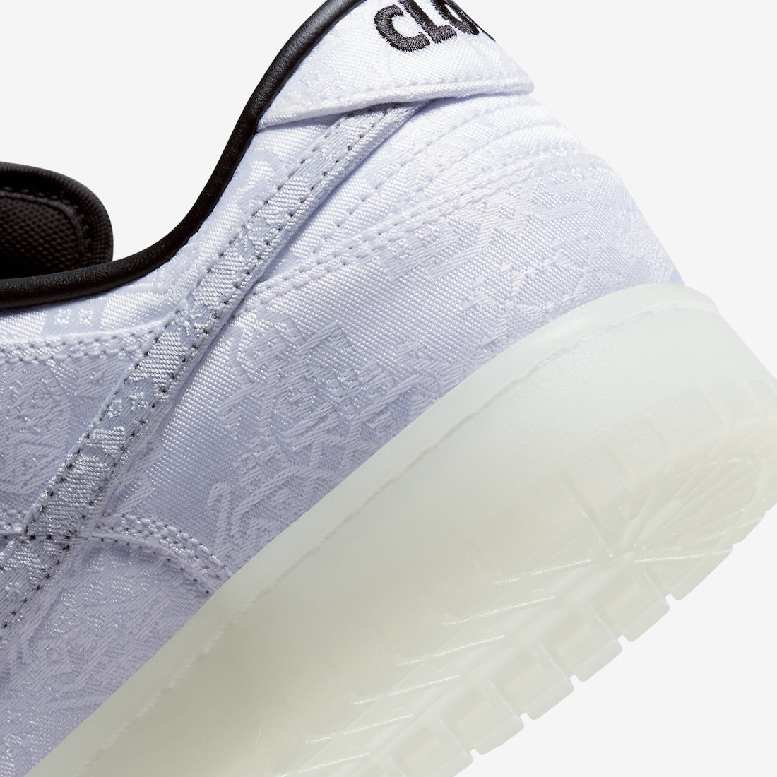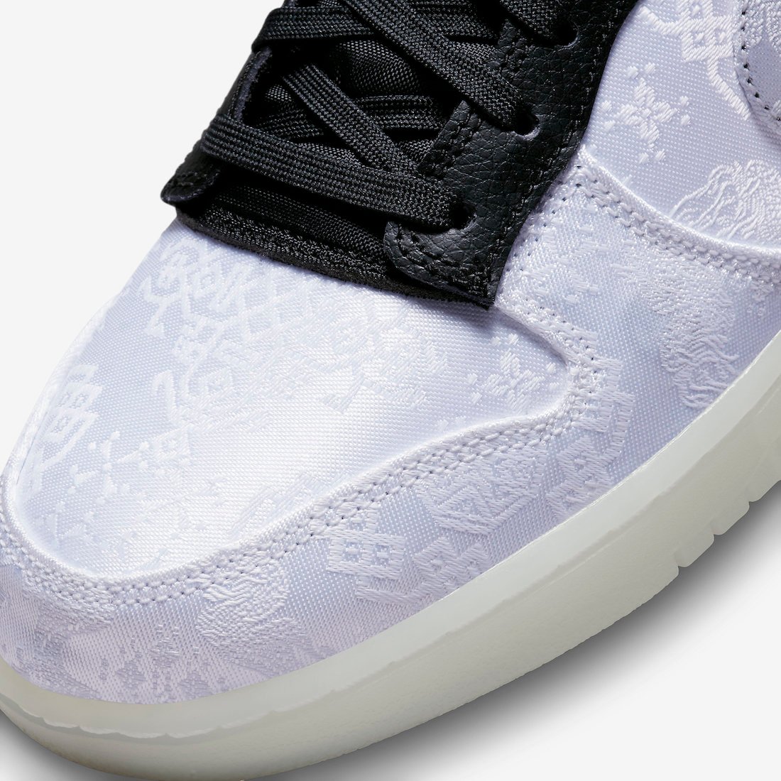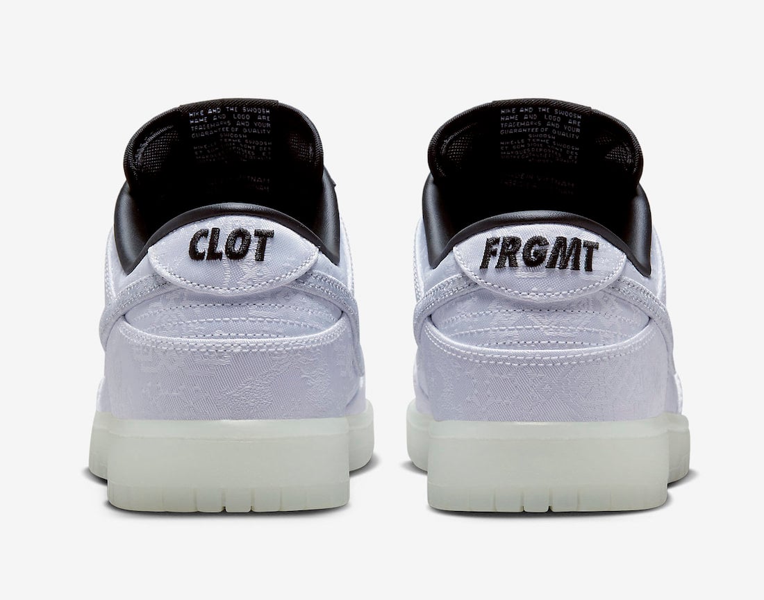 Currently, it isnโt known what the inspiration is for the Clot x Fragment x Nike Dunk Low. However, the shoes will come in a White and Black color combination while constructed with a silk tearaway upper. Black appears on the leather eyestay and liner. Next, โFRGMTโ branding is embroidered on the heels, with Clot and Fragment logos on the insoles. Finishing the look is a translucent outsole. This collaboration will come with special packaging.