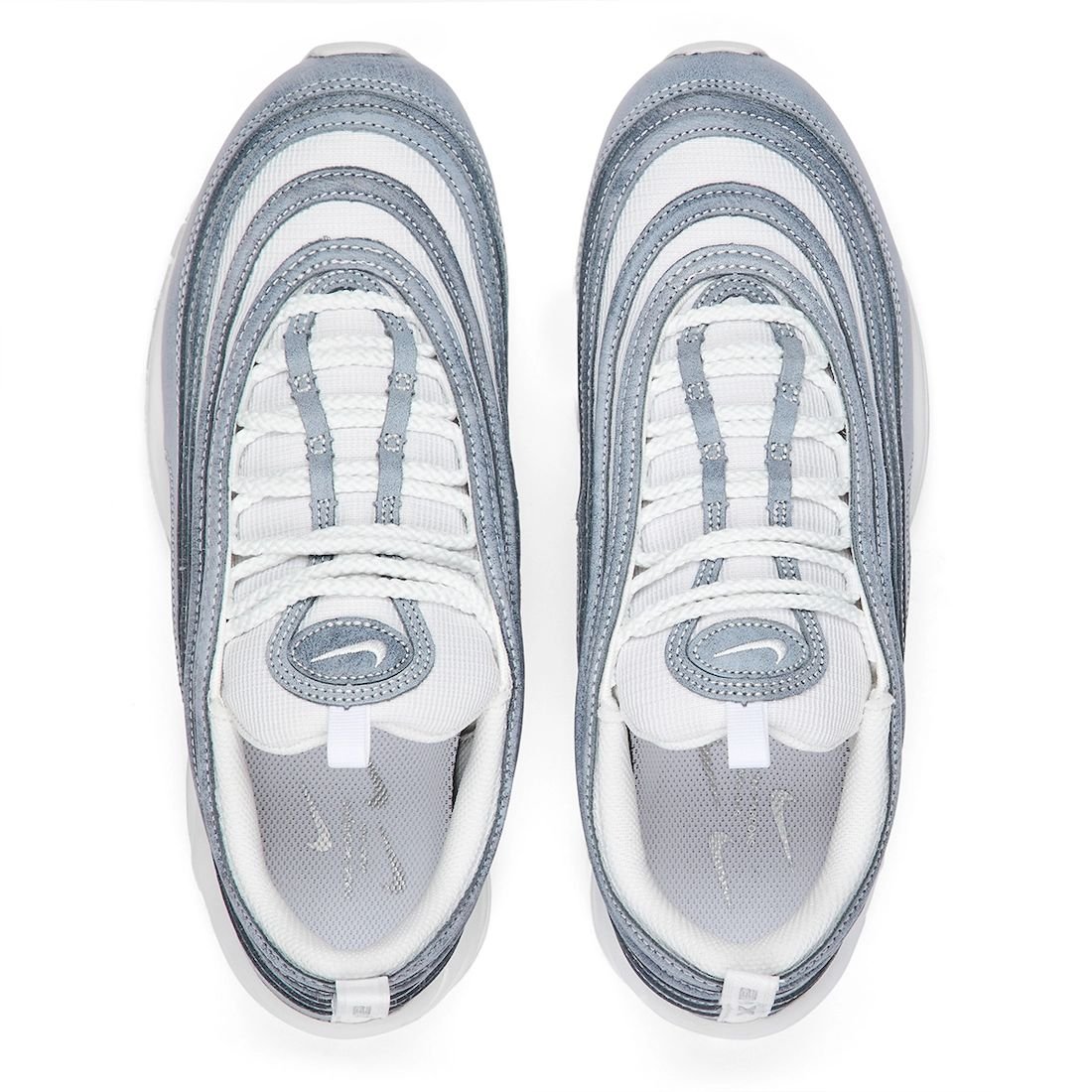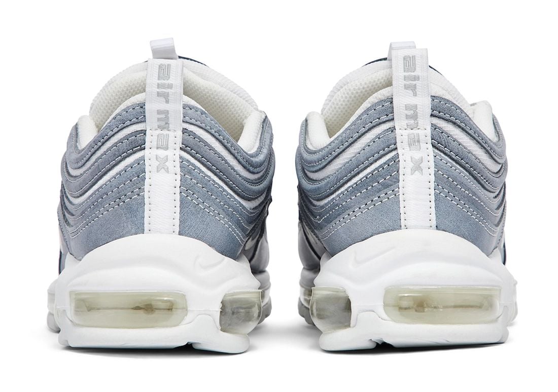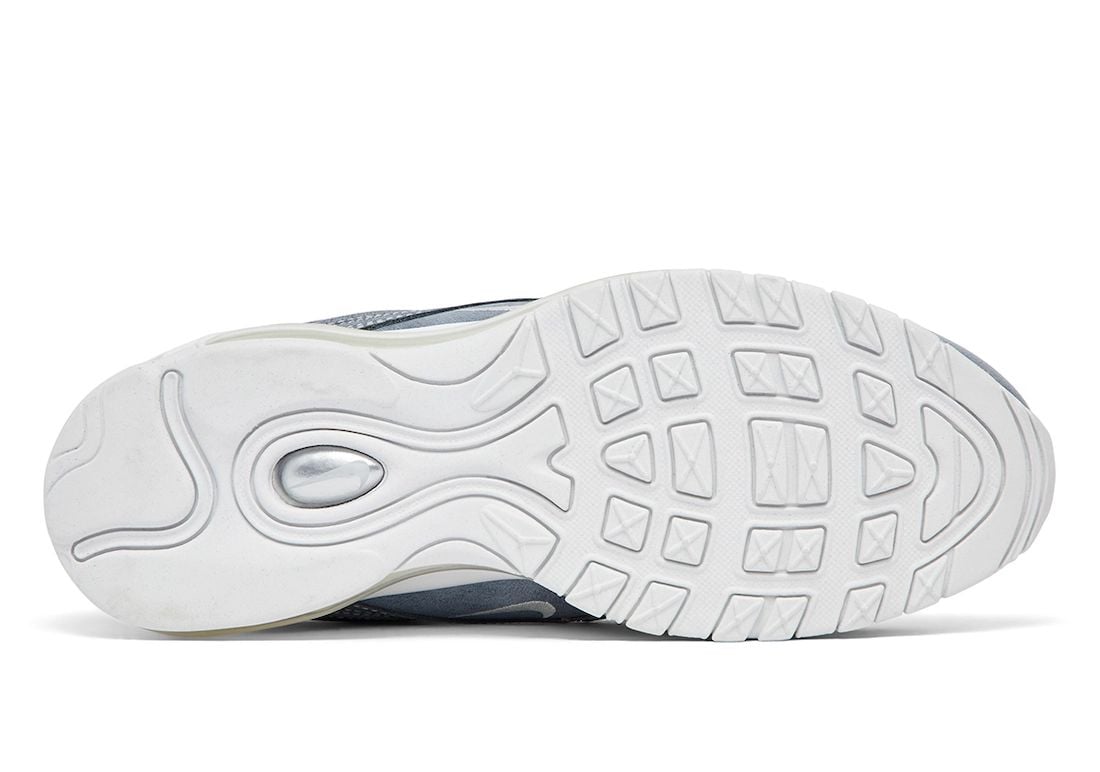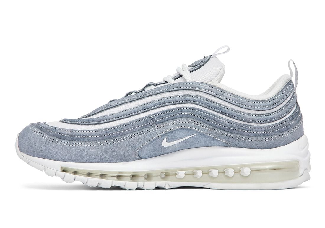 The CDG x Nike Air Max 97 collaboration will be available in two colorways. One pair will feature a Blue – Grey upper while White adorns the midsole, tongue, laces, heel, and rubber outsole. The other pair features mostly Black throughout with minor White details. Other details include an acid wash upper and the traditional visible Air unit.