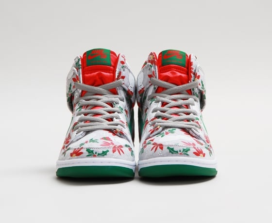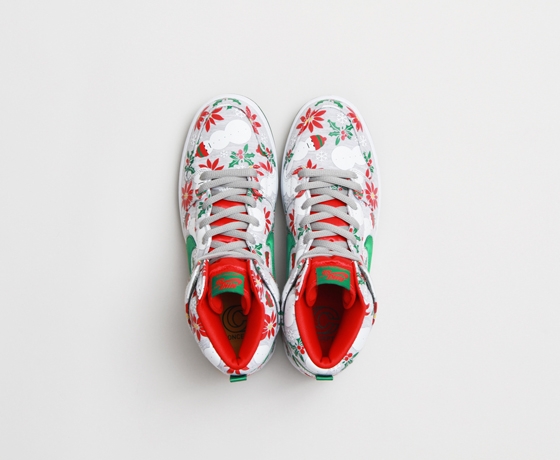 What too dons a cool Christmas aesthetic, this Nike SB Dunk High displays a distinct grey heather, pink green, and university red colorway with intricate details that include bold Swoosh branding and commemorative insole graphics. These official say it all if you ask us!