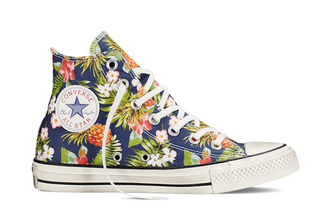 This Converse Chuck Taylor All Star features a dark Denim base but the loudness is brought out by the print overlaying it. As you can see, flowers are spread throughout along with Green foliage and even a pineapple. This pair probably is inspired by the tropical weather of Hawaii. In addition, White runs through the midsole and across the toe with minimal Black accents.
