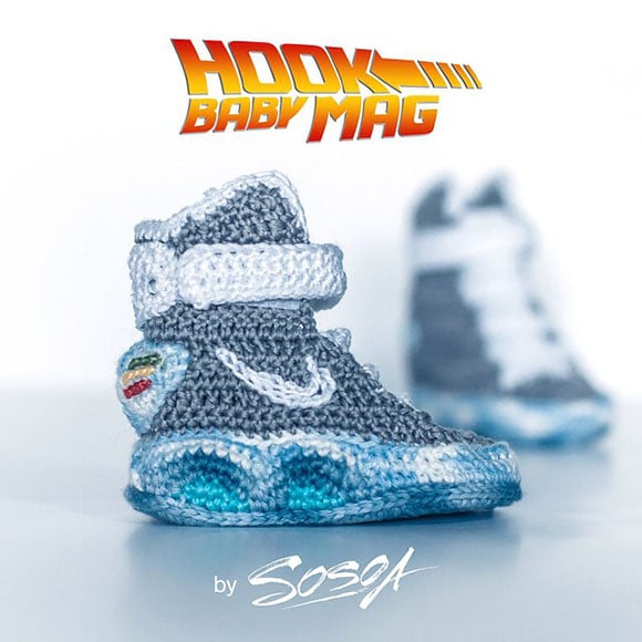 Created by talented crocheter Sosoa, the Air Mag’s shown look pretty close to the actual release. Of course they won’t light up or anything, but a great amount of detail has gone into them as you can see it appears LED lights are present, the swoosh, strap and translucent sole.