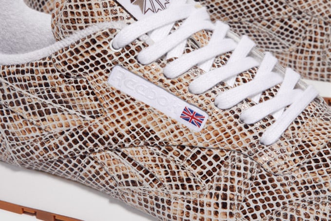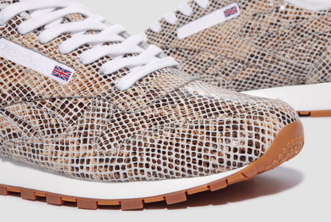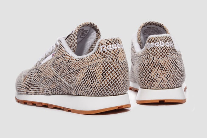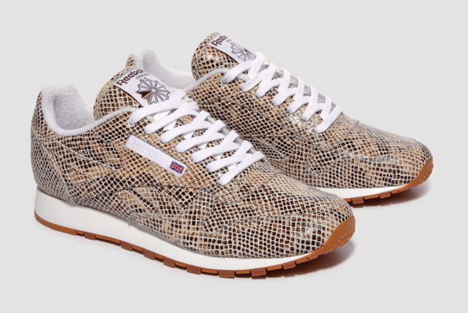 Taking inspiration from Patrick Cox’s snakeskin Wannabe loafer and the 1990’s garage, jungle and hardcore scenes, this Reebok Classic Leather is full of several details worth mentioning. As Crooked Tongues has it, this timeless style delivers an authentic look with an all-over python detailed upper made from premium leather materials, classic towel material lining, white branding that pays homage to classic All-White, and a gum outsole that serves as a perfect finish.