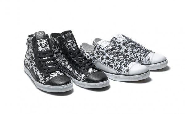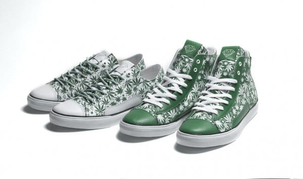 Coming in the form of Diamond’s Brilliant High and Low silhouettes, green and black versions of both silhouettes will be offered, each decked out in an all-over cannabis leaf print.