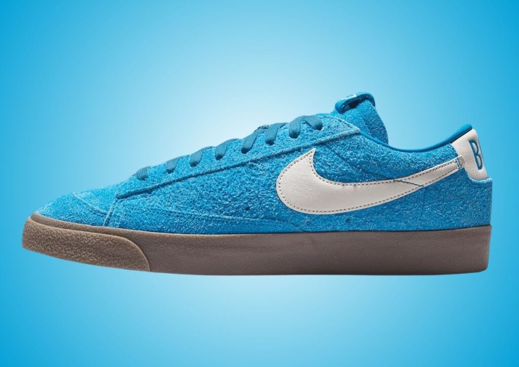 This Nike Blazer Low is dressed in a Surf Blue, Sail, and Gum Dark Brown. As you can see, the shoes feature suede across the upper in Blue, while White graces the large Swoosh on the panels. The heels are also unique, as the backdrop is White with โBOOKโ written across to reflect Blazer PEs from the 1970s. The tongue and insoles feature Chevy branding and an exposed foam tongue. Other details include special hangtags of the Chevy logo and D/B Blazer, a Gum sole, and retro packaging with paper inspired by old-school car catalogs.