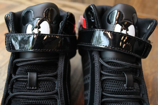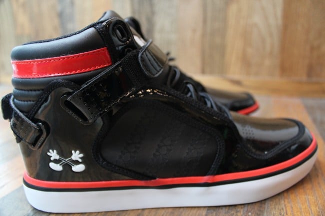 This model features a combination of black full grain leather and patent, red accenting and white midsole for that added contrast. In place of the adidas badging, Disney brands the model with “angry Mickey” on the tongue and skull-n-cross bones style “X” on the heel.