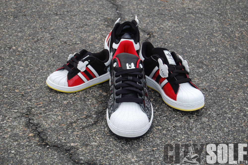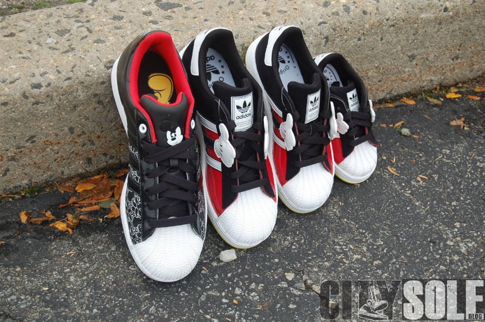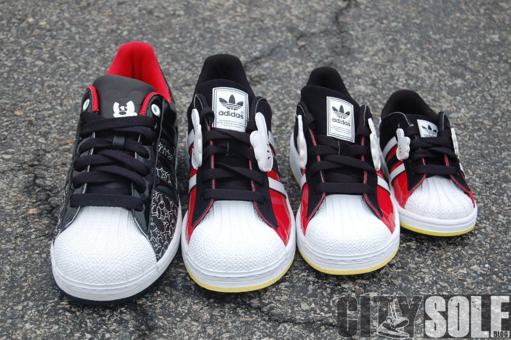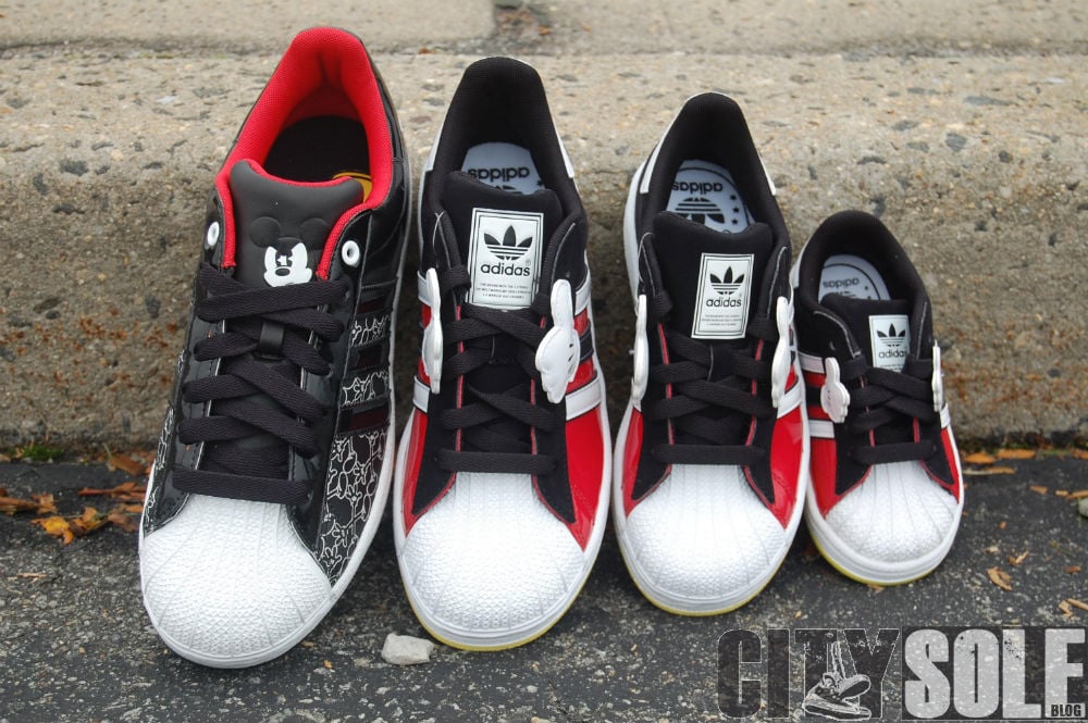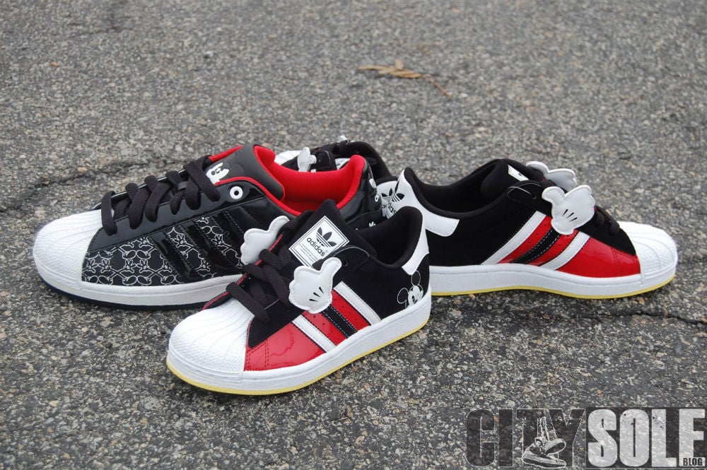 Like the Disney x adidas Originals adiRise mid, ย The Disney x adidas Superstar shares the same colorway and design cues. This family of kicks each feature something unique in various sizes. The adult sized Superstar features tonal black paten leather uppers with a Mickey Mouse inspired “all-over”ย pattern with “Angry Mickey” embossed on the tongue with red insole accents. The GS sizes feature red and black uppers, and topped off with Mickey’s famous four-finger glove on each side of the shoe.
