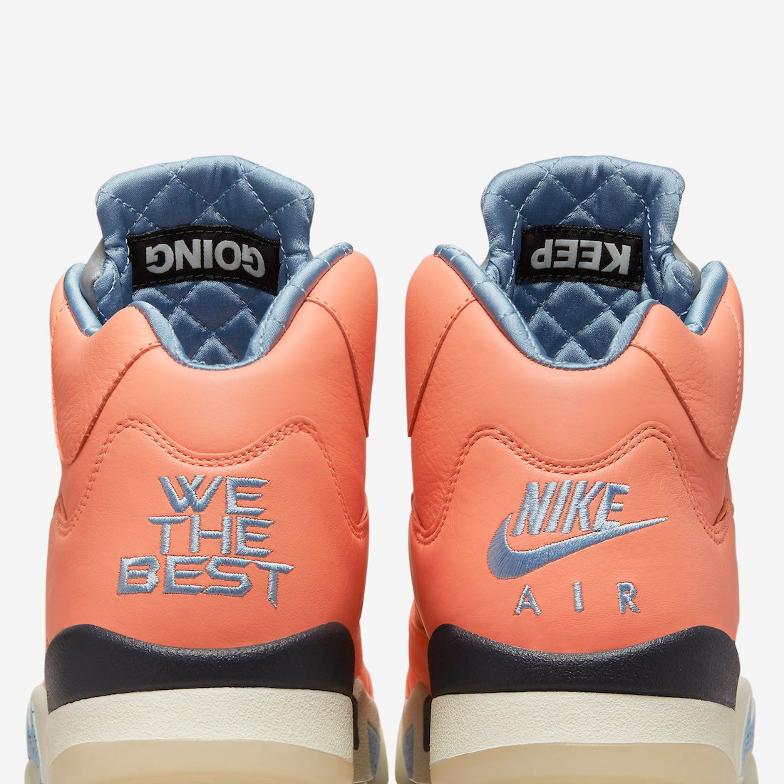 Included in the collection are four colorways of the Air Jordan 5 that comes dressed in Pink/Orange, Bone/White, Blue, and Bright Purple. As well, there are a few additional colorways that could be samples. Each pair features leather on the upper, bright accents throughout, as well as โWe The Bestโ and โNike Airโ branding on the heels. The premium theme continues with the addition of quilted liners. Adding to the theme, โKeepโ and โGoingโ labels are placed on the inside of the tongues. Other details include a translucent outsole that showcases โWe The Bestโ on the right shoe. Also, each pair will come with special packaging.