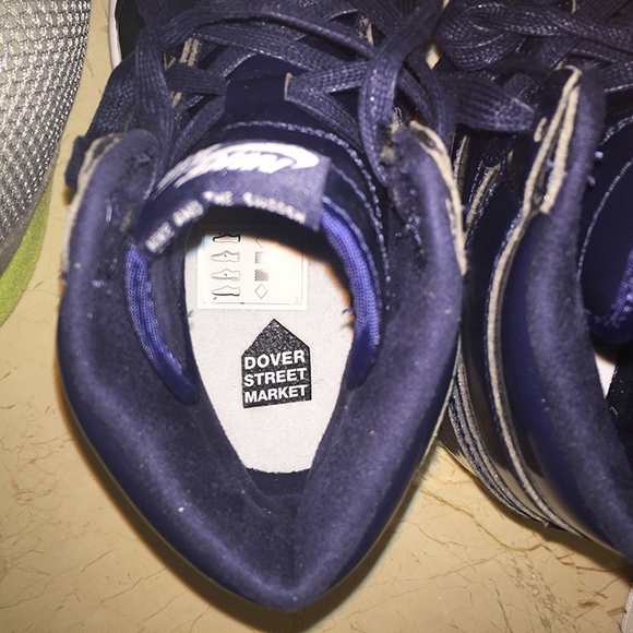 Using the Air Jordan 1 High, the model comes with a blue patent leather upper with a finishing iridescent shine. Lastly solid white is used on the midsole, all in all a simple yet unique collaboration. The only place we have seen (so far) the Dover Street Market branding is on the insole.