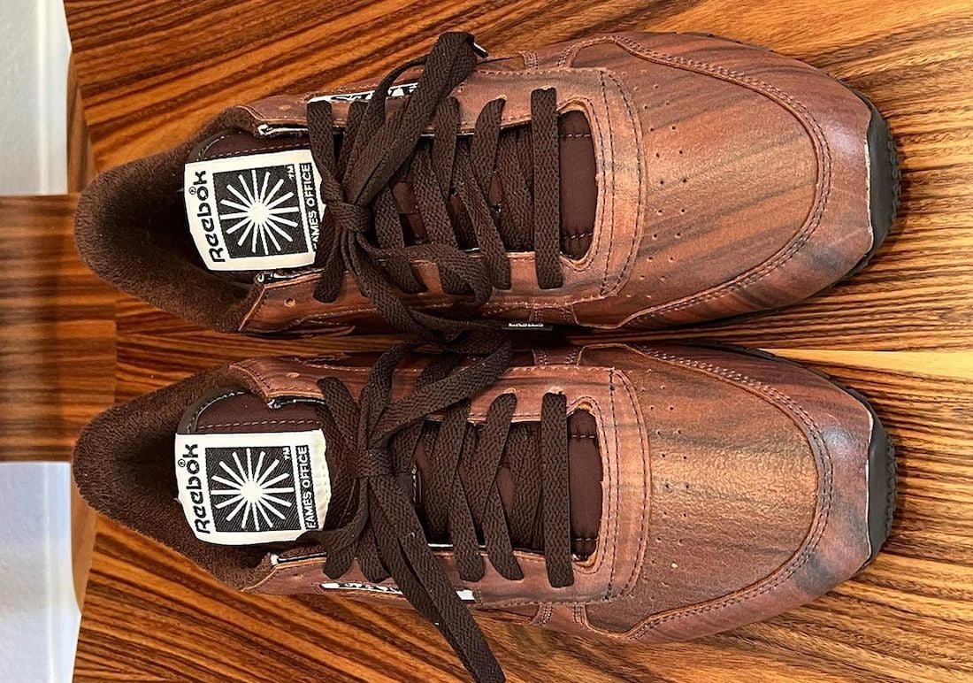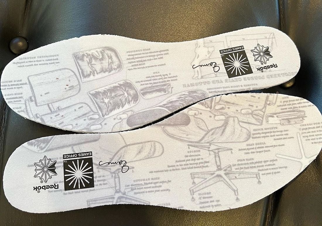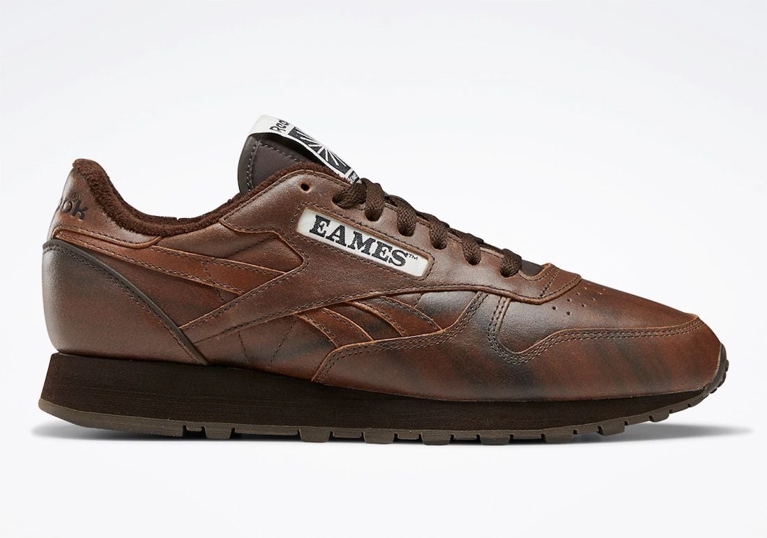 Inspired by the sweeping Rosewood plywood shell of the iconicย Eames Lounge Chair and Ottoman, the Reebok x Eames Classic Leather โRosewoodโ features a woodgrain print on the specialty leather upper that mimics the appearance of Rosewood, a favorite material of Charles and Ray. An original exploded diagram of theย Eames Lounge Chair & Ottomanย is reproduced on the insoles.