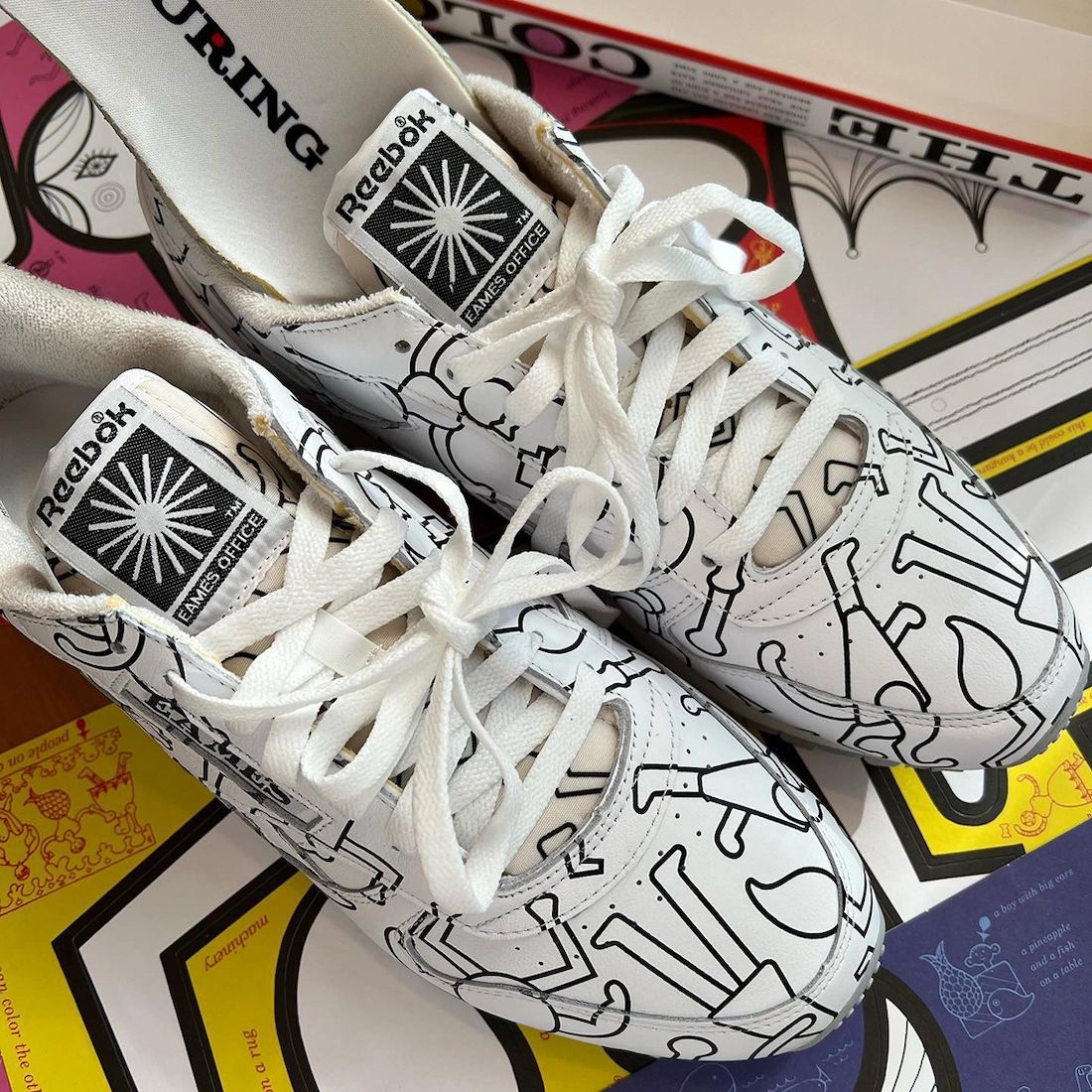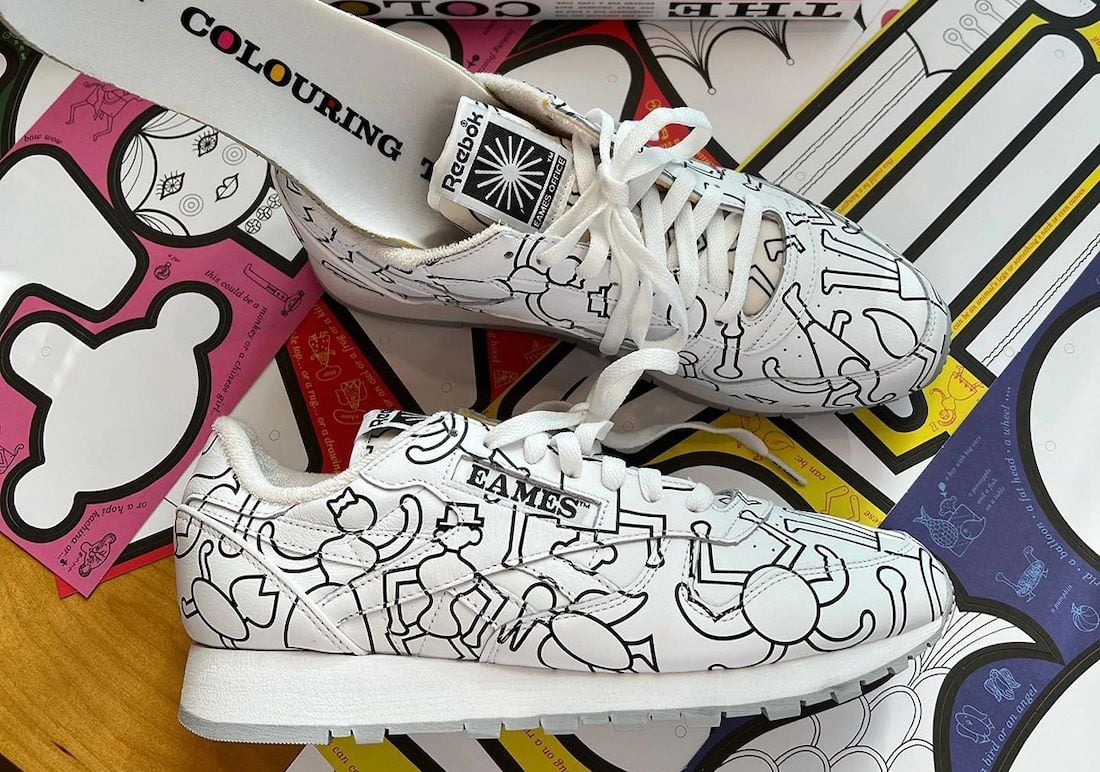 Inspired by the Eamesโ 1955 The Coloring Toy childrenโs coloring and construction kit, the Reebok x Eames Classic Leather โThe Coloring Toyโ features bold geometric outlines stamped across pristine white garment leather uppers. In the spirit of playful hands-on experimentation, wearers are encouraged to color in the shapes and transform each pair into a uniquely personal design object. The Reebok x Eames Classic Leather โThe Coloring Toyโsโ insole features the original Coloring Toy logo and a reinterpretation of the toyโs original instructions re-written by Eames Demetrios. These will be available on June 2nd exclusively from Eamesoffice.com, followed by a June 3rd release from Reebok.com and select retailers.