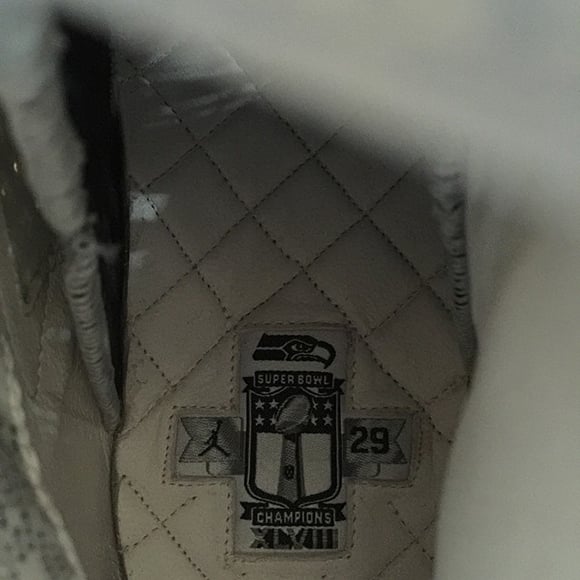 The Superbowl Champions Air Jordan 6 features a chrome upper that is so shiny you can almost see yourself in them. Solid black hits the laces, while a translucent blue tinted sole and tongue is in place. A quilted leather insole with the Seattle Seahawks and Jordan Brand logo, Earl Thomas’s number 29 and writing that reads “Super Bowl Champions XLVIII”.