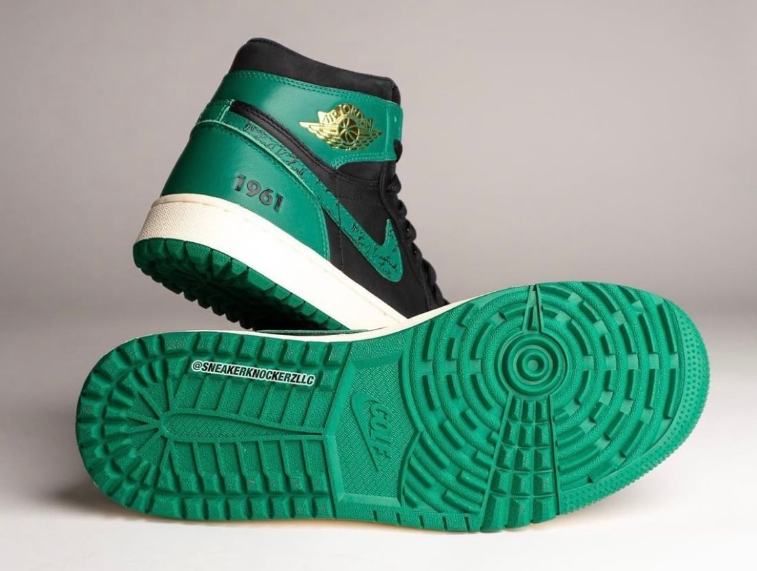 This Air Jordan 1 comes dressed in a Black, Malachite, Metallic Gold, and White color combination. Constructed with leather throughout, mesh on the tongues, and have an overall premium build. Next, Black runs across the base, while Malachite, a shade of Green appears on the ankle, across the toe box, around the heel, and Swoosh. Gold fills in the Wings logo on the ankle with โEastside Golfโ in cursive is repeated on the Swooshes. Highlighting the shoes is โChangeโ and โ1961โ on the heels, and a special logo on the tongues. Other details include a White midsole and integrated traction thats ready for the golf course on the rubber outsole.