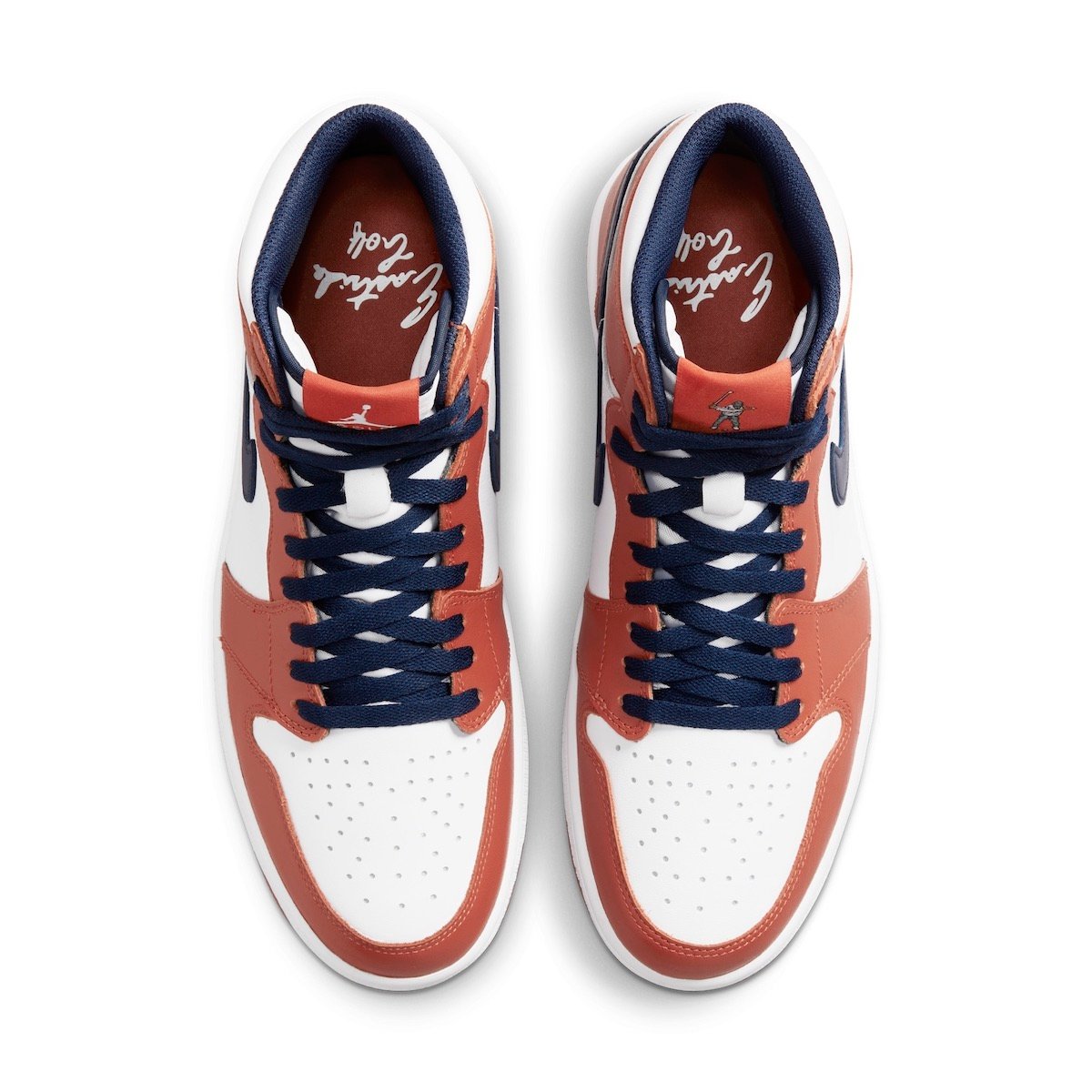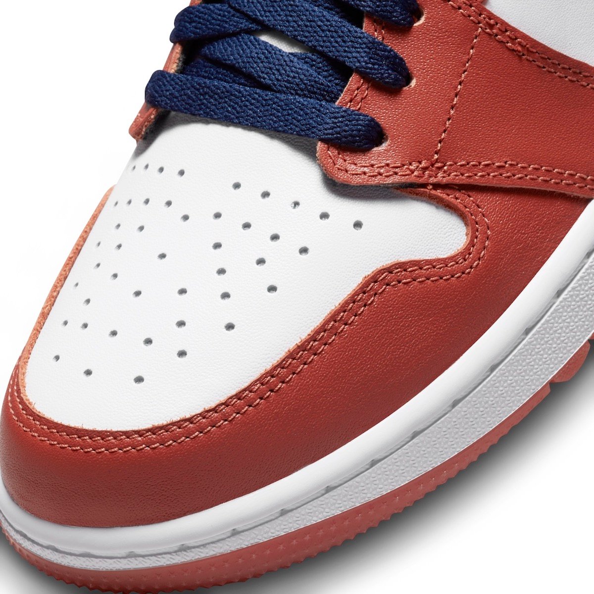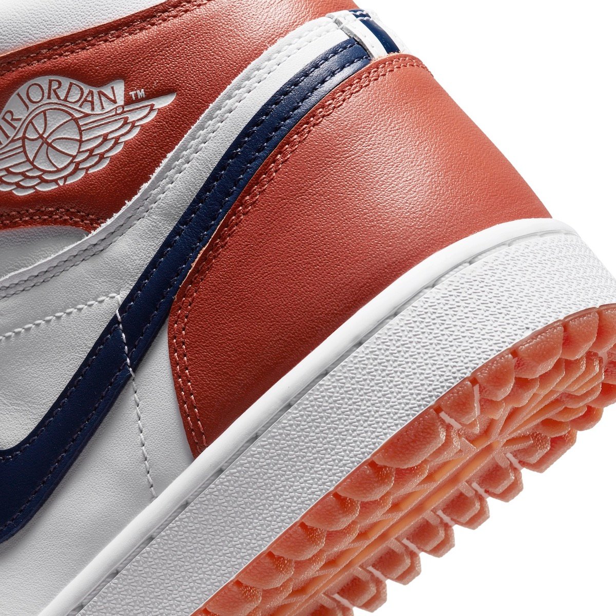 This Air Jordan 1 features a Burnt Sunrise, Midnight Navy, White, and Metallic Gold color combination. Constructed with leather and mesh, the pair comes with mismatched branding on the tongue labels and Metallic Gold lace tips. Next, Eastside Golfโs branding appears on the insoles and special integrated traction on the outsole to hit the links. Other details include hangtags and unique packaging.