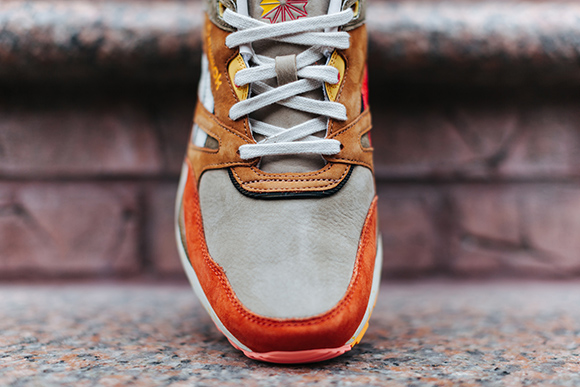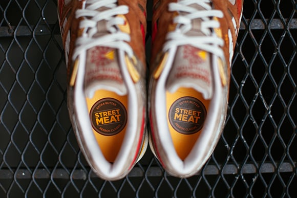 Keeping the inspiration close to home, Extra Butter used the popular food carts that strolled the New York streets during the 1990s serving up halal. Using euphoria nubuck, you can actually make drawings with your fingers that embed for a few seconds so you know it’s soft. The uppers are inspired by what is served with Halal, lamb, chicken, and falafel. Furthermore the speckled midsole comes from blong yellow rice, outsole is under cooked chicken, green lands on the arch support foot bridge representing lettuce and two sets of laces in red and white for the side sauce.