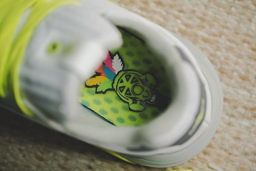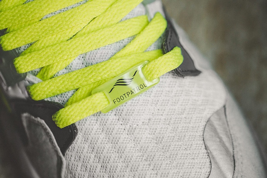For this collaboration inspiration comes from London key city moment of Notting Hill Carnival. Highlighted with a mixture of overlays on the upper with a mixture of stark Whites, subtle Greys with bursts of Neon Yellows lifting the shoe. The Torsion bar itself is coated in a vibrant marble effect of color, bringing a sense of spirit that carnivals are known for. Footpatrol branding appears in an lenticular effect on the tongue alongside W1/W11 postcodes representing both Footpatrol and Notting Hill.