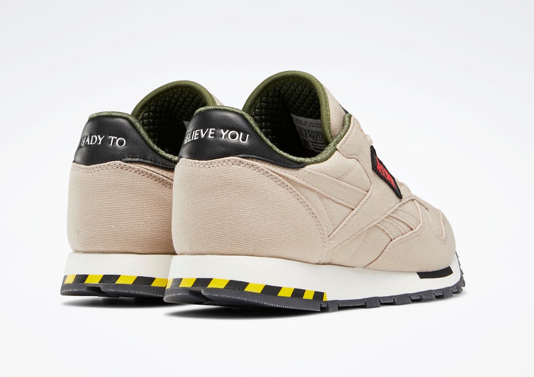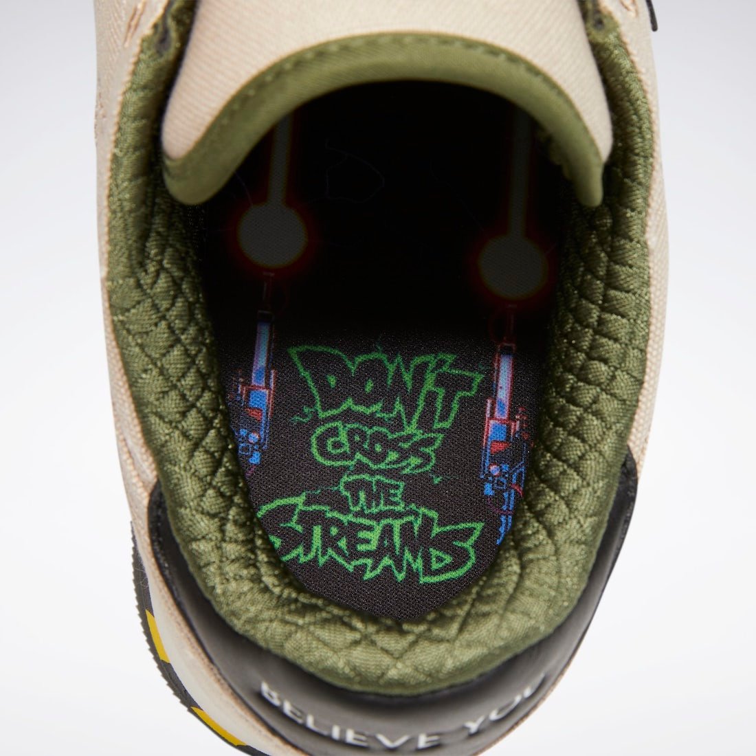 Dressed in a Modern Beige, Black, and Blaze Yellow color combination. Beige canvas across the upper and overlays while the Ghostbusters logo is applied to the tongue. Furthermore, a Dark Green quilt covers the liner, and on the insoles, it reads โDonโt Cross The Streams.โ Additionally, more branding lands on the heel, and Reebok written on the panels while caution tape hits the mostly White midsole. Lastly, Black covers the rubber outsole, but there are select areas with a Bright Green to resemble slime.