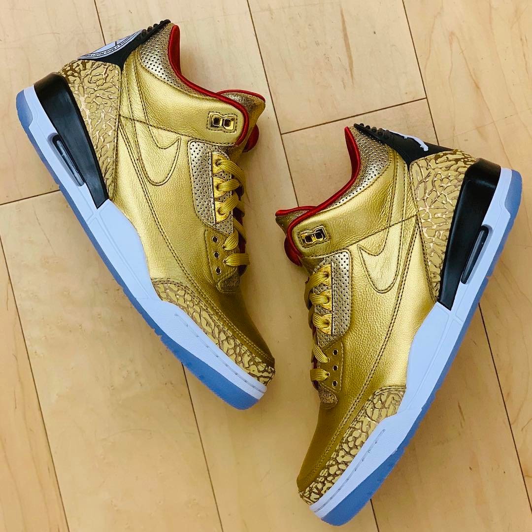 Looking closer this Air Jordan 3 features Gold throughout the upper to resemble the Oscars trophy. In addition they have minimal Red accents along with White on the midsole. Around the heel is Black along with an icy translucent outsole. Finishing the look is a White Jumpman on the left heel while the right heel features Spike Leeโs production company logo, 40 Acres and a Mule Filmworks.