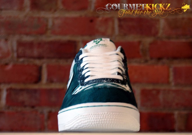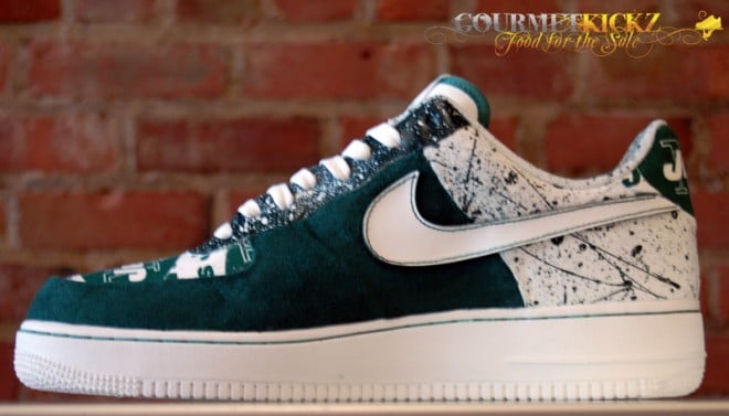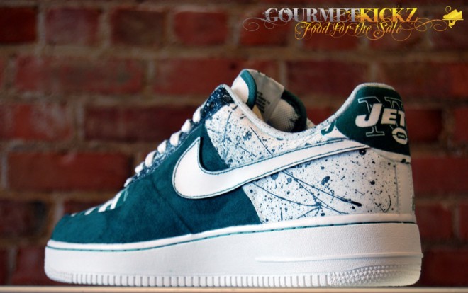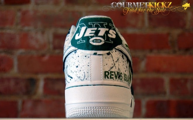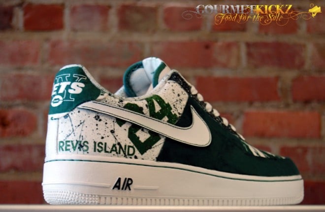 Following their recent work on a “South Beach” Foamposite Pro and “Copperhead Snakeskin” Foamposite Oneย comes this awesome custom Air Force 1 Low for New York Jets star Darrelle Revis. ย Featuring Jets graphic paneling and premium deep green nubuck, these are some highly quality kicks for sure.
