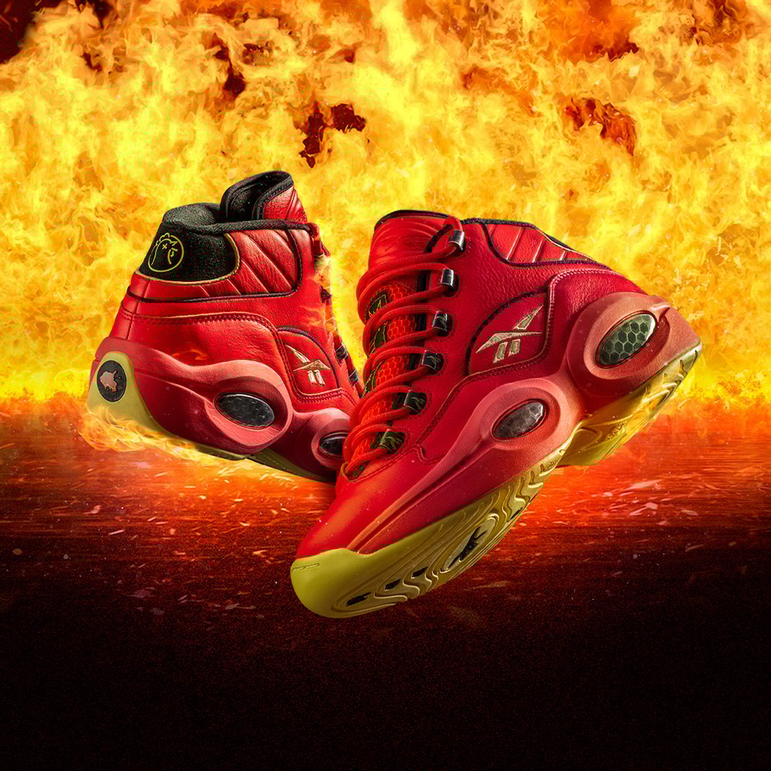 A convergence of two fire traditions, the Hot Ones x Reebok Question Mid nods to Hot Onesโย iconic โThe Last Dab Apolloโ sauce faced by the showโs fearless guests.ย The sneaker kicks up the spice levels on Reebokโs hottest heritage basketball model with a face-melting red upper, Hexalite cushioning and fiery Hot Ones branding on the heel, among other tasty features.
