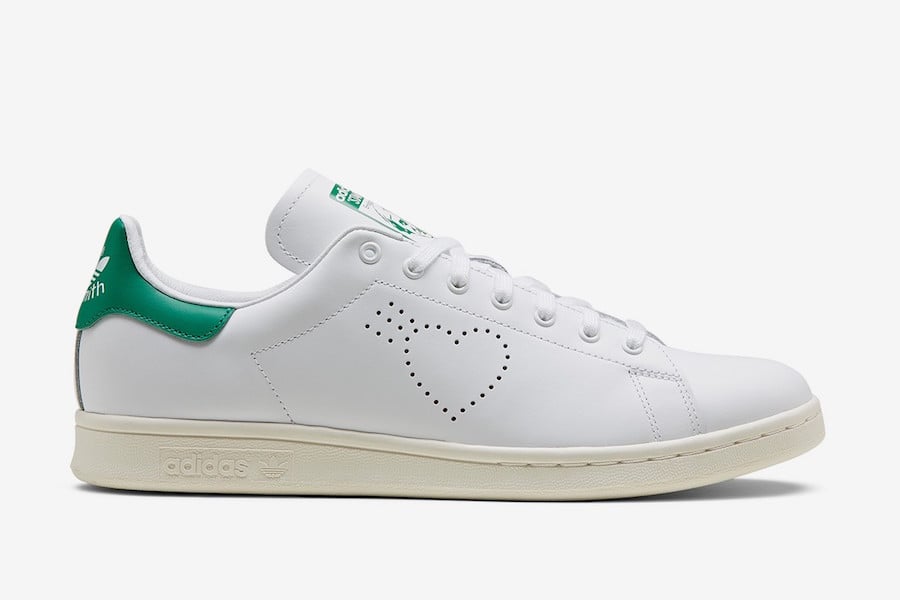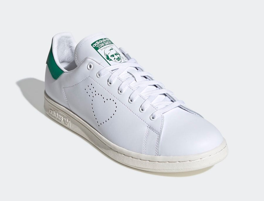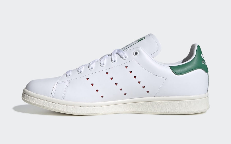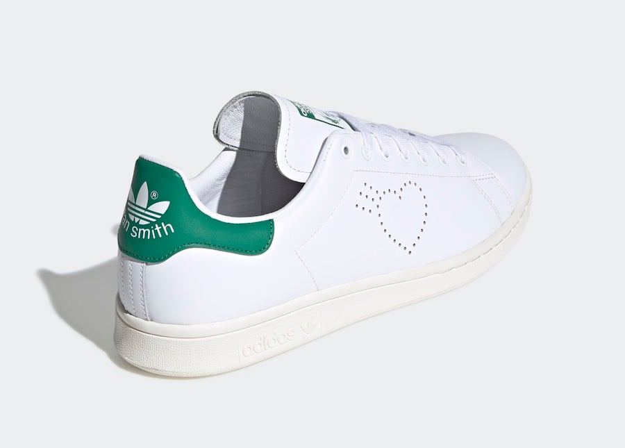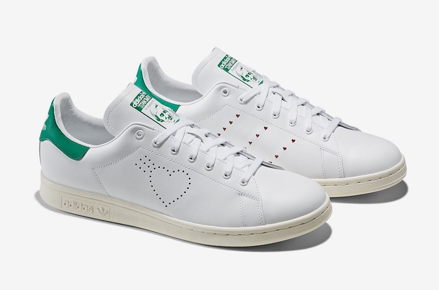 This adidas Stan Smith comes highlighted with White leather across the upper while Green lands on the tongue and heel. Following we have Human Madeโs logo perforated on the panels which replaces the traditional Three Stripes branding on the lateral side. On the medial side we have the iconic Three Stripes branding but its in the shape of hearts.