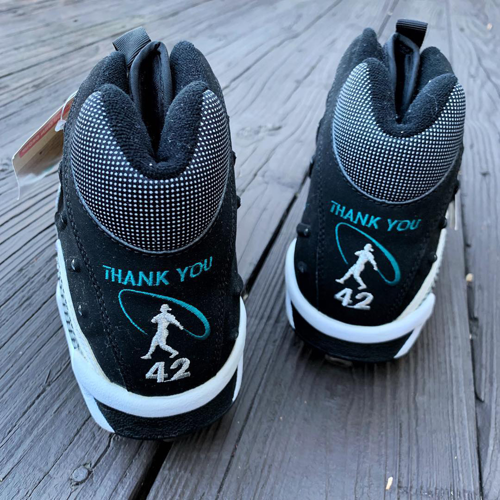 Back in 2012, Nike released a special edition Air Max Griffey Furyโs in honor of Jackie Robinson. The shoe dawns that Iconic Dodger blue that has become synonymous with Jackie, aligns with vibrant orange laces and Griffeyโs patented โ24โ on the ankle. The red under the bottom makes the entire shoe pop, reminiscent of that iconic Dodger jersey.