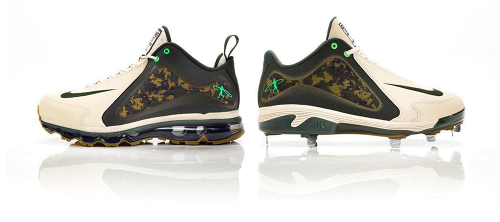 Later in 2013, Nike released the Air Max 360 Swingman and Swingman MVP Metal cleats in honor of Robinson. This time, Nikeโs approach was an homage to Jackieโs service in the Army prior to him breaking into the league. The shoes are a majority sand-tan colored with the iconic camouflage splashes on the sides. The shoe is topped off with a neon green logo of Jackieโs iconic swing, matching with the top two lace holes.